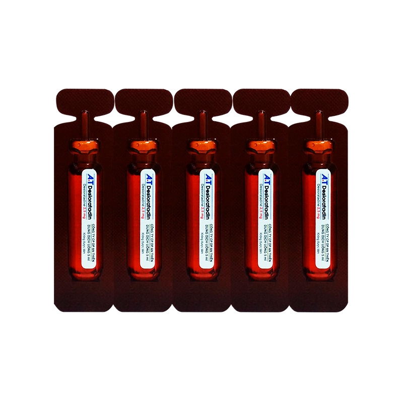 Mô tả ngắn: A.T Desloratadin 2.5mg ống 5ml là thuốc chống dị ứng, dạng dung dịch uống đóng gói trong ống 5 ml, hộp 30 ống do Công ty An Thiên sản xuất. Dung dịch uống màu đỏ và có mùi dâu.