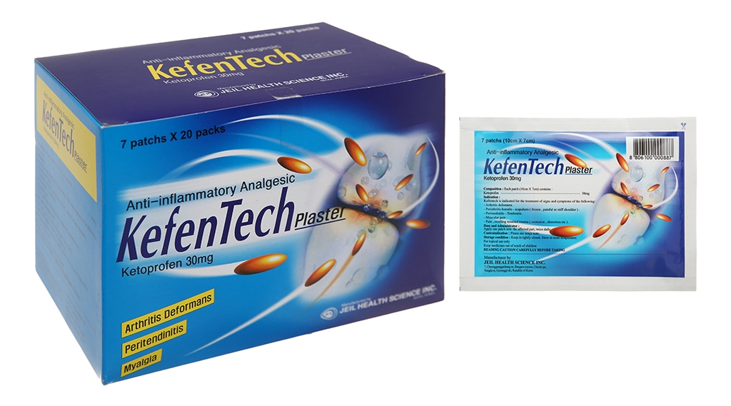 Mô tả ngắn: Cao dán Kefentech của Công ty JEIL HEALTH SCIENCE INC được phân phối bởi Công ty Thương Mại Dược Phẩm Cát Thành, hoạt chất chính là ketoprofen. Thuốc được sử dụng để điều trị các dấu hiệu và các triệu chứng trong những trường hợp sau: Viêm khớp biến dạng viêm khớp dạng thấp; viêm quanh khớp xương cánh tay vai (đau, cứng, tê vai); viêm bao gân, viêm gan; đau cơ. Ngoài ra, thuốc còn được dùng để điều trị sưng, đau do chấn thương. Cao dán Kefentech được bào chế dưới dạng cao dán. Vì ở dạng cao dán thuốc trực tiếp hấp thu qua da vào đến mô cơ xương và khớp nên làm giảm tác dụng phụ toàn thân so với các thuốc kháng viêm không steroid dạng uống. Mỗi miếng dán 10 x 7 cm có chứa 30 mg Ketoprofen. Hộp 20 gói x 5 miếng dán; Hộp 20 miếng x 7 miếng; Hộp 20 gói x 10 miếng.