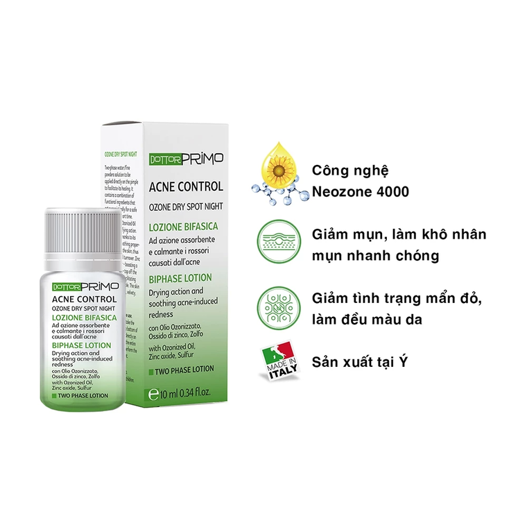 DottorPrimo Acne Control Ozone Dry Spot Night là kem hỗ trợ điều trị mụn được thiết kế sử dụng vào ban đêm, thời điểm quan trọng để tái tạo, phục hồi các tế bào da bị tổn thương. Sản phẩm chứa các thành phần chuyên biệt dành cho da mụn như Sulfur, Salicylic acid, Zinc oxide. Đây đều là các thành phần an toàn, không gây tổn hại cho da, có tác dụng loại bỏ tế bào chết, bã nhờn dư thừa, vi khuẩn và bụi bẩn bị mắc kẹt. Làm khô còi mụn nhanh, không làm cho phần nhân mụn bị chai cứng dưới da.