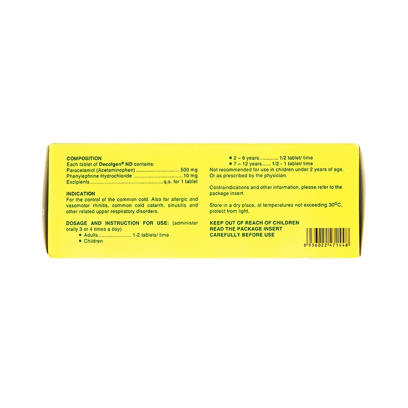 Mô tả ngắn: Decolgen Nd là sản phẩm của Công ty TNHH United International Pharma có thành phần chính là Paracetamol (acetaminophen), Phenylephrine Hydrochloride dùng điều trị các triệu chứng cảm thông thường, viêm mũi dị ứng, viêm mũi vận mạch, viêm màng nhầy xuất tiết do cúm, viêm xoang và các rối loạn của đường hô hấp trên.