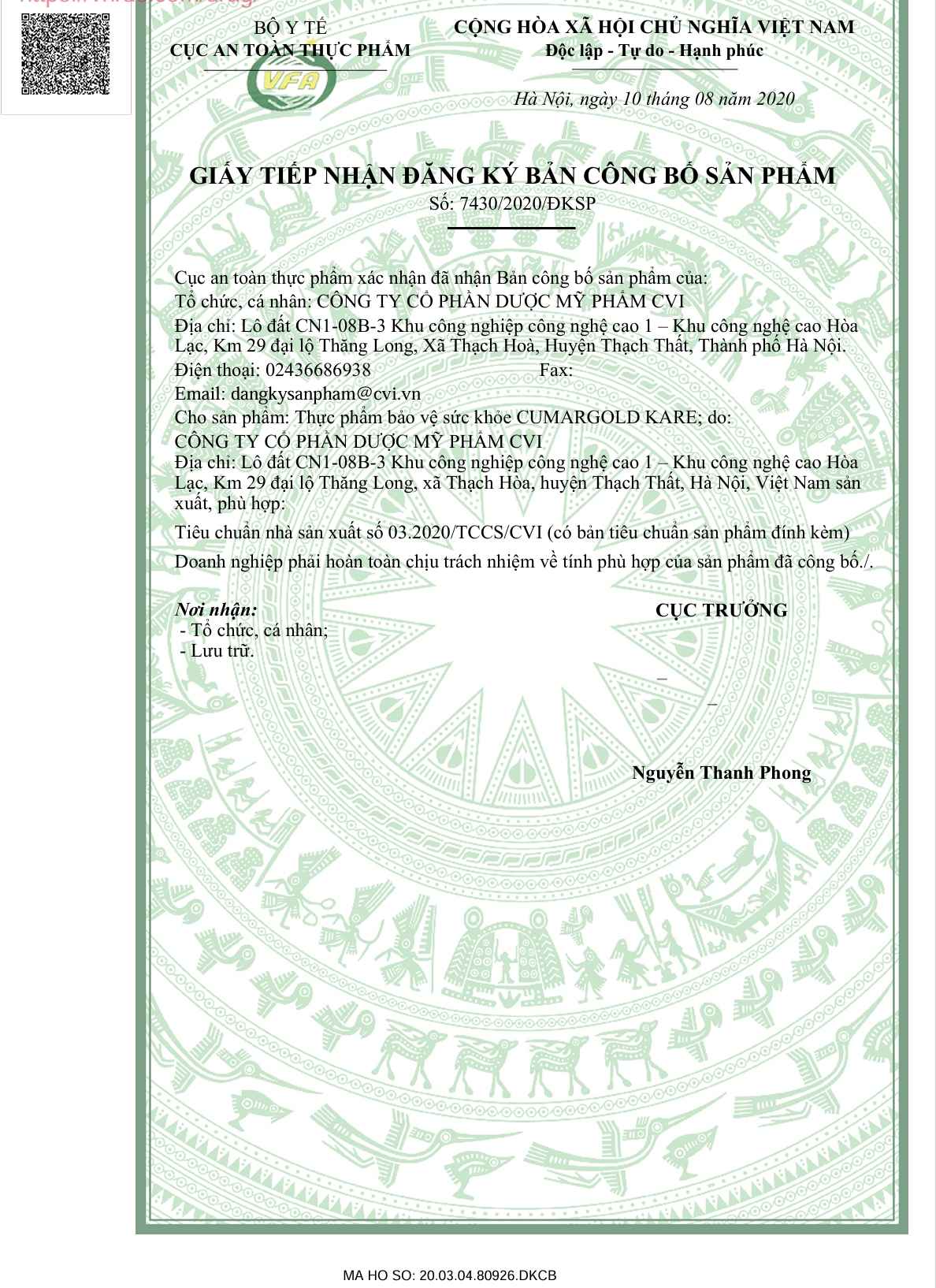 Cumargold Kare là thực phẩm bảo vệ sức khỏe hỗ trợ tăng cường miễn dịch và nâng cao thể trạng, giảm mệt mỏi đồng thời hỗ trợ giảm tác dụng phụ của hóa xạ trị. Cumargold Kare là sản phẩm duy nhất được Unesco vinh danh và Bộ Khoa Học Công Nghệ cấp bằng sáng chế.