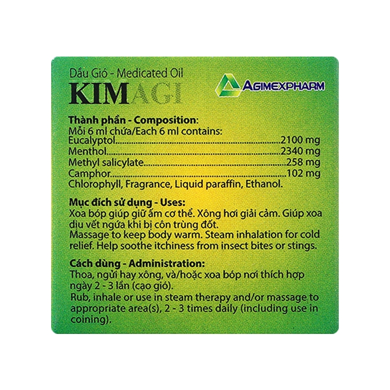 Dầu gió Kim Agi Xanh có thành phần chủ yếu là tinh dầu bạc hà, trong đó có hai thành phần là Menthol và Methyl salicylate cùng các thành phần khác. Nhờ chứa Methyl Salicylate, Menthol và Eucalyptol, Camphor dầu gió Kimagi Agimexphar 6ml có tác dụng trong việc hỗ trợ giảm đau, cảm cúm, cảm lạnh và giảm nhanh các cơn đau, đặc biệt là đau đầu, đau bụng, đau dây thần kinh, đau cơ và đau nhức xương khớp.