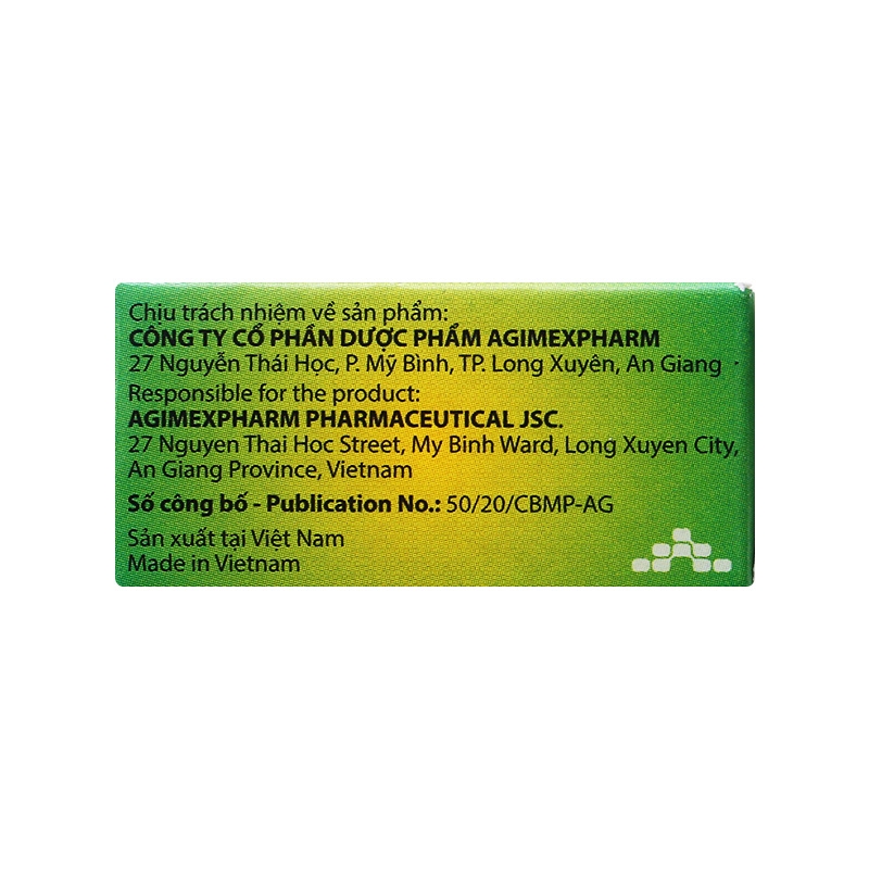 Nhà sản xuất: Chi nhánh Công ty Cổ phần Dược phẩm Agimexpharm – Nhà máy Sản xuất Dược phẩm Agimexpharm.