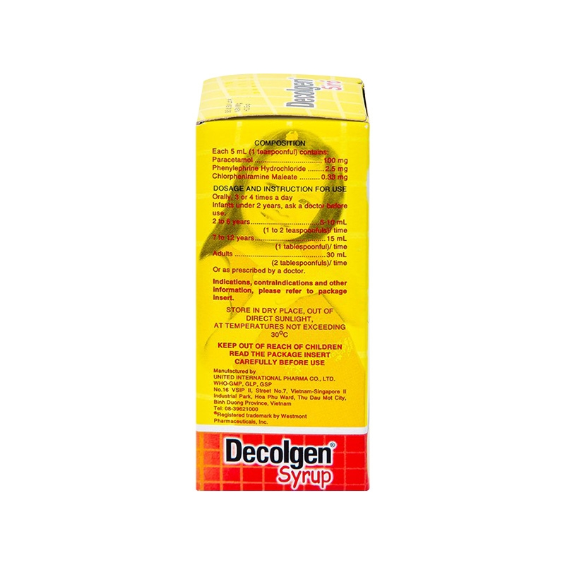 Mô tả ngắn: Siro Decolgen 60Ml của công ty TNHH United International Pharma, thành phần chính paracetamol, phenylephrine hydrochloride, chlorpheniramine maleate, là thuốc dùng để điều trị các triệu chứng cảm thông thường, viêm mũi dị ứng, viêm mũi vận mạch, viêm màng nhầy xuất tiết do cúm, viêm xoang và các rối loạn của đường hô hấp trên.