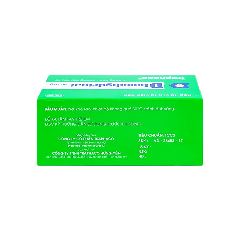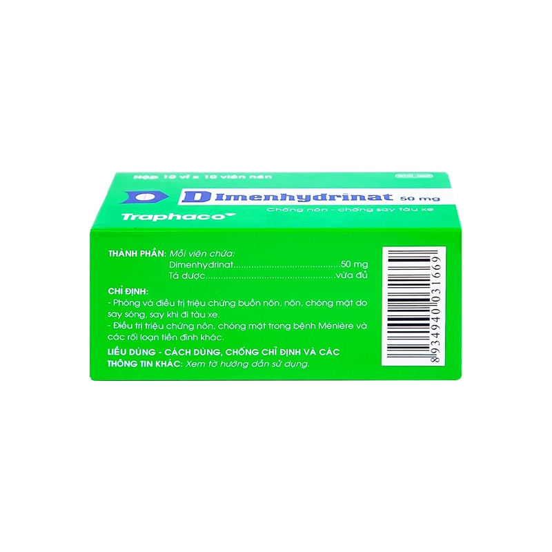 Mô tả ngắn: Thuốc Dimenhydrinat 50Mg của Công ty cổ phần Traphaco - Việt Nam, thành phần chính Dimenhydrinat 50 mg là loại thuốc có tác dụng điều trị chứng say tàu xe; phòng và điều trị các chứng buồn nôn do nhiều nguyên nhân khác nhau (trừ do hoá trị liệu ung thư).