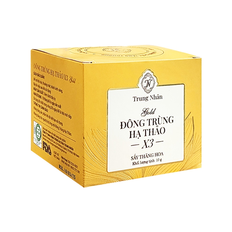 Đông Trùng Hạ Thảo X3 Gold là sản phẩm của Công ty TNHH Đông Trùng Hạ Thảo Trung Nhân, Trung Nhân luôn luôn thực hiện nghiêm ngặt và kiểm tra chặt chẽ cho từng khâu trong quá trình sản xuất để đảm bảo sản phẩm sạch và chất lượng cao cam kết sản phẩm : KHÔNG CHẤT BẢO QUẢN, KHÔNG CHẤT TĂNG TRƯỞNG, KHÔNG PHẨM MÀU. Vì lý do đó, sản phẩm Đông Trùng Hạ Thảo Trung Nhân đã đạt các chứng nhận An toàn vệ sinh thực phẩm, VietGAP, ISO 22000, HACCP, và được FDA chứng nhận sản phẩm đạt tiêu chuẩn an toàn chất lượng.