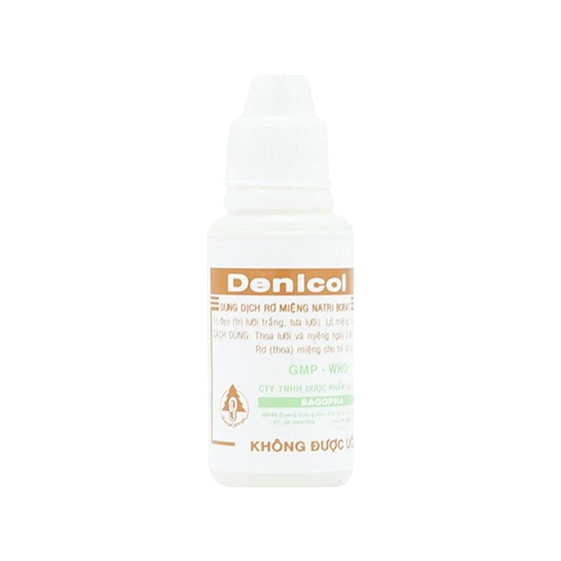 Mô tả ngắn: Dung dịch rơ miệng Denicol có chứa Natri borat decahydrate 3,87g với công dụng trị đẹn (trị lưỡi trắng, tưa lưỡi), lở miệng, sưng lợi (sưng nướu). Sản phẩm dung dịch rơ miệng có dạng chất lỏng sánh, trong suốt, mùi vani.