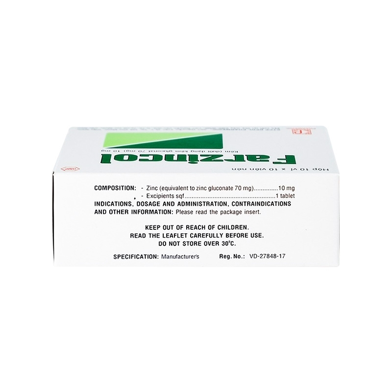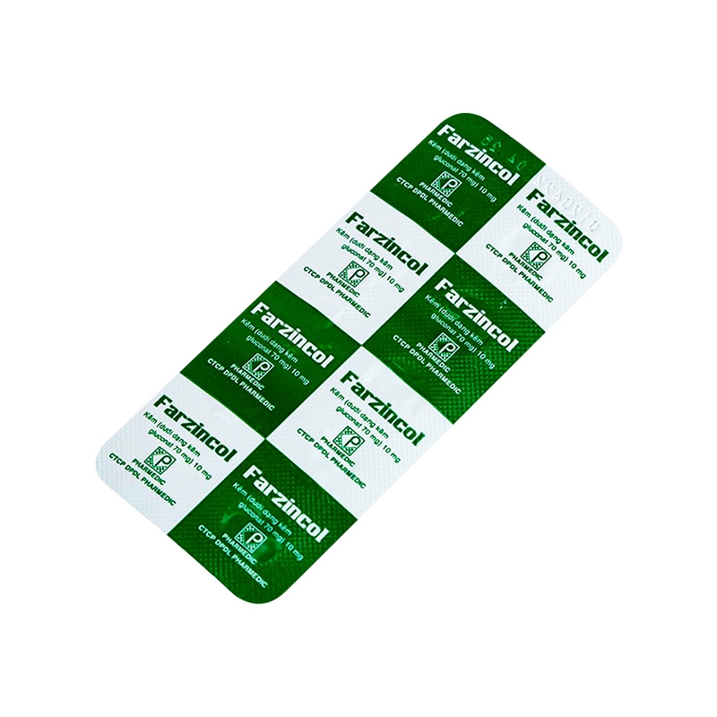Mô tả ngắn: Farzincol của công ty cổ phần dược phẩm dược liệu Pharmedic, thành phần chính kẽm gluconat 70 mg (tương đương 10 mg kẽm), là thuốc dùng để điều trị bổ sung kẽm vào chế độ ăn trong các trường hợp: Bệnh còi xương, chậm tăng trưởng ở trẻ em. Phụ nữ mang thai và bà mẹ đang cho con bú. Chế độ ăn thiếu cân bằng hoặc kiêng ăn. Nuôi ăn lâu dài qua đường tĩnh mạch. Tiêu chảy cấp và mãn tính. Điều trị thiếu kẽm: Thiếu kẽm nhẹ và vừa trong các trường hợp: Suy dinh dưỡng nhẹ và vừa. Rối loạn đường tiêu hóa: Chán ăn, chậm tiêu, táo bón nhẹ, buồn nôn và nôn khi mang thai. Khó ngủ, mất ngủ, trẻ khóc đêm, suy nhược, nhức đầu...