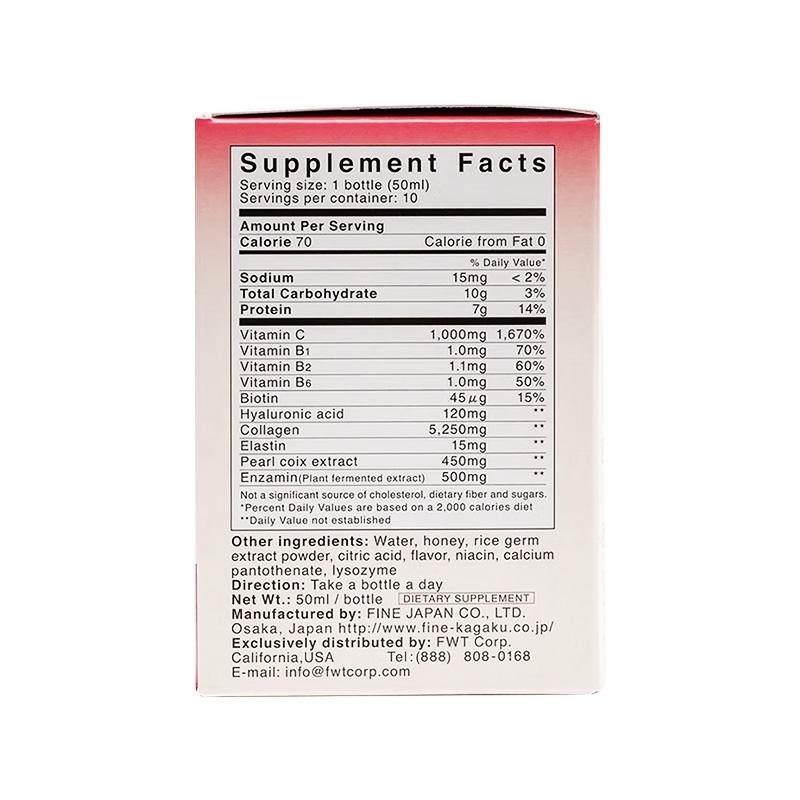 Bên cạnh hai thành phần chính, nước uống Fine Japan còn bổ sung hệ dưỡng chất phong phú gồm Vitamin C, nhóm B (B1, B2, B6), chiết xuất hạt Ý dĩ, Biotin, Elastin,... giúp làm sáng da, tăng cường kết cấu săn chắc của làn da, móng, tóc,...