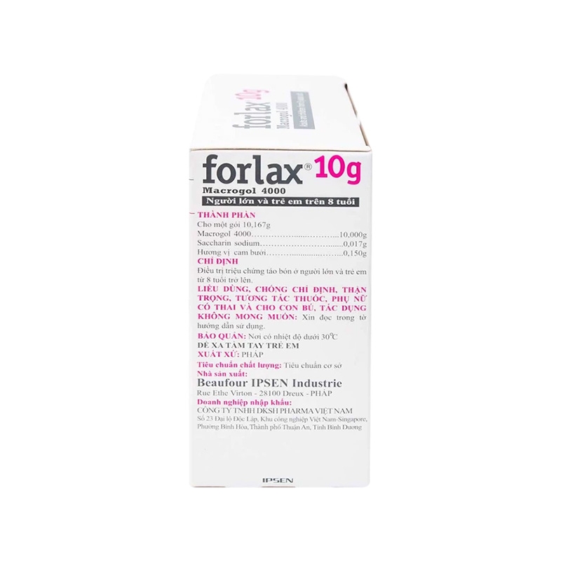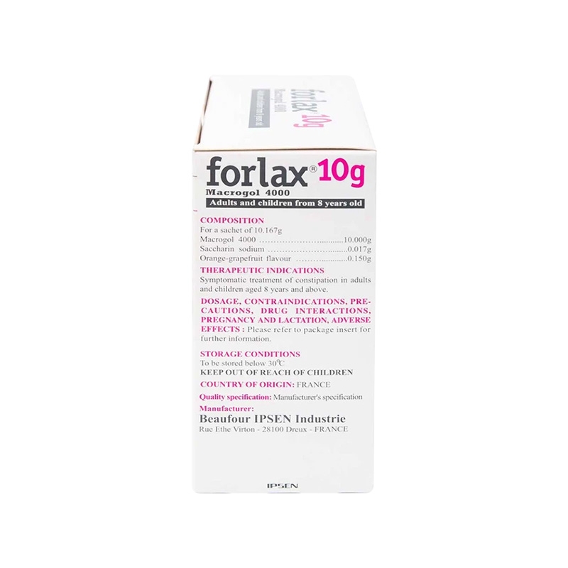 Mô tả ngắn: Thuốc Forlax được sản xuất bởi Beaufour Ipsen Industrie, với thành phần chính Macrogol, là thuốc dùng để điều trị triệu chứng táo bón ở người lớn và trẻ em trên 8 tuổi. Thuốc Forlax dạng gói bột pha thành dung dịch uống. Mỗi gói một liều chứa bột màu trắng với mùi và hương vị cam bưởi.