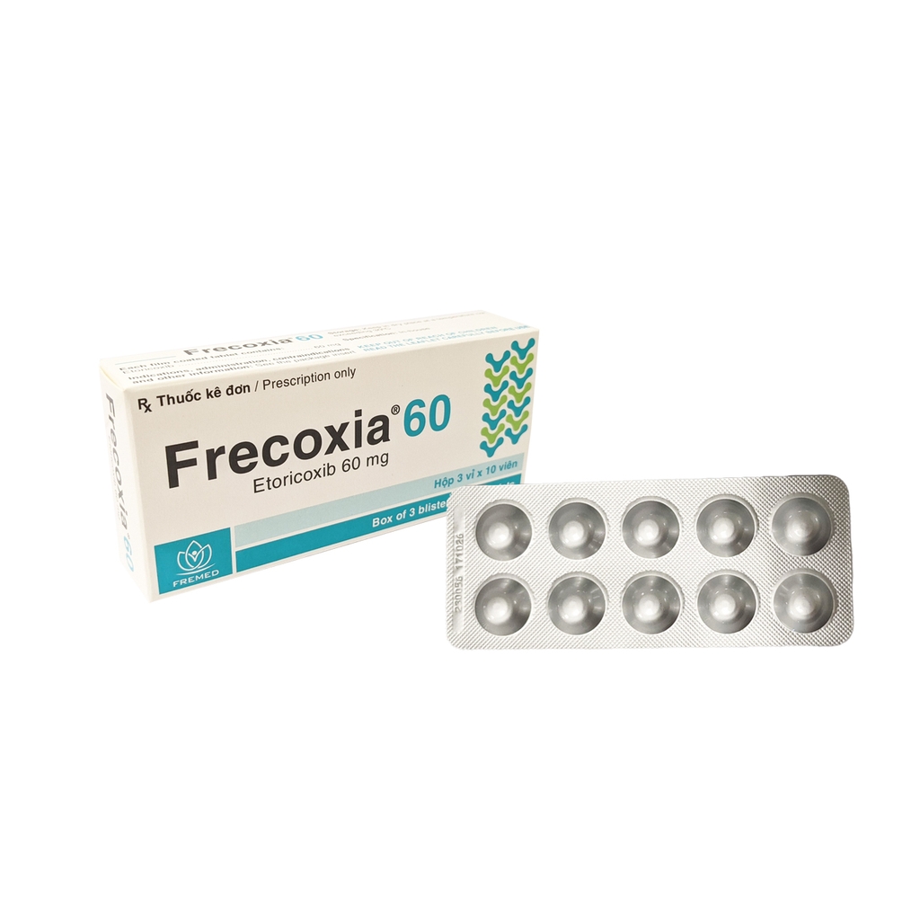 Mô tả ngắn: Thuốc Frecoxia 60 là sản phẩm của Công ty Cổ phần Dược phẩm Fremed, có thành phần chính là Etoricoxib. Đây là thuốc được sử dụng để điều trị cấp tính và mãn tính các dấu hiệu và triệu chứng bệnh thoái hoá khớp và viêm khớp dạng thấp; điều trị viêm viêm đốt sống dính khớp, viêm khớp,điều trị các cơn đau cấp tính, bao gồm chứng đau bụng kinh nguyên phát; điều trị ngắn hạn các cơn đau vừa liên quan đến phẫu thuật răng.
