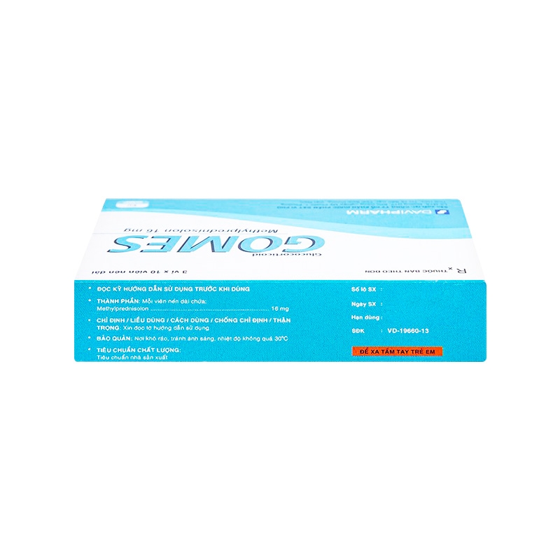 Mô tả ngắn: Gomes dạng viên nén của Công ty Cổ phần Dược phẩm Đạt Vi Phú, thuốc có thành phần chính là Methylprednisolon. Thuốc có tác dụng trong liệu pháp không đặc hiệu cần đến tác dụng chống viêm và giảm miễn dịch của Glucocorticoid đối với: Viêm khớp dạng thấp, lupus ban đỏ hệ thống, một số thể viêm mạch và những bệnh dị ứng nặng gồm cả phản vệ, trong điều trị ung thư như bệnh leukemia cấp tính, u lympho, ung thư vú và ung thư tuyến tiền liệt. Methylprednisolon còn có chỉ định trong điều trị hội chứng thận hư nguyên phát.