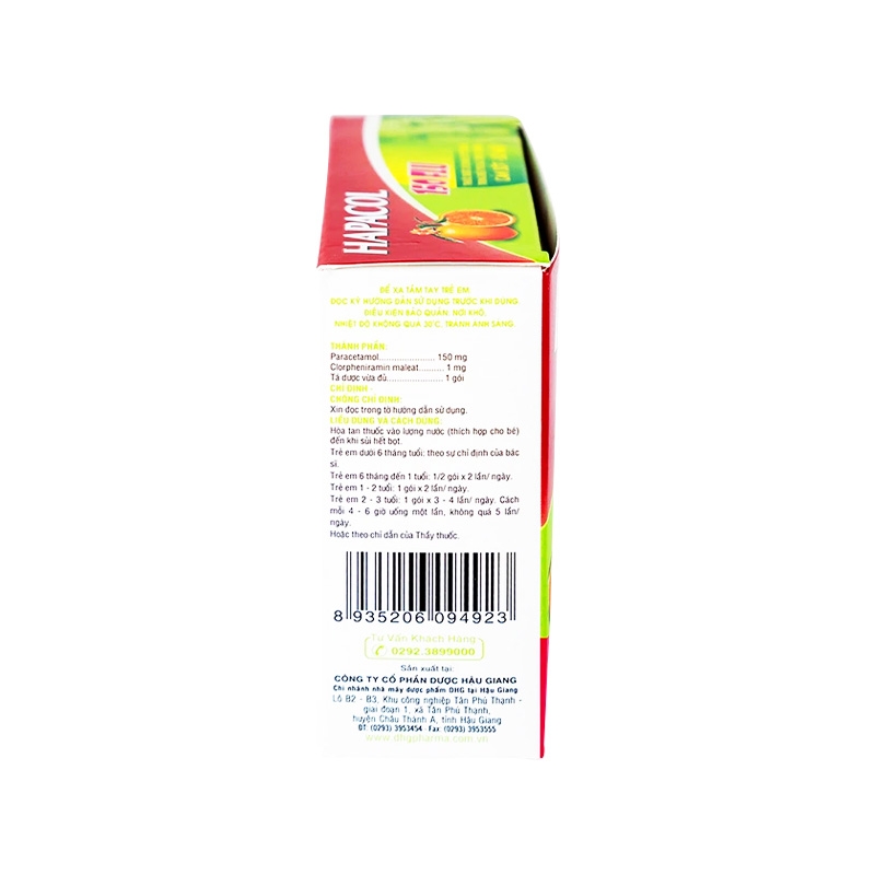 Mô tả ngắn: Viên sủi Hapacol 150 Flu là sản phẩm của Công ty Cổ Phần Dược Hậu Giang, hoạt chất chính là Paracetamol và Clorpheniramin, thuốc dùng để trị các trường hợp: Cảm sốt, nghẹt mũi, sổ mũi, chảy nước mũi, viêm mũi, viêm màng nhầy xuất tiết, viêm xoang, đau nhức như đau đầu, đau cơ bắp, xương khớp do cảm cúm hoặc do dị ứng với thời tiết. Hapacol được bào chế dưới dạng thuốc bột sủi bọt, hòa tan trong nước trước khi uống có mùi thơm, vị ngọt, thích hợp dành cho trẻ em. Hộp 24 gói x 1,5 g.
