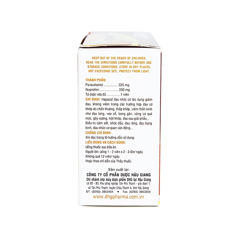Mô tả ngắn: Thuốc Hapacol Đau Nhức 325/200 DHG là sản phẩm được sản xuất bởi công ty cổ phần Dược Hậu Giang, thuốc có được chất chính là paracetamol, ibuprofen. Thuốc được có tác dụng giảm đau, kháng viêm trong các trường hợp do chấn thương, viêm khớp… Thuốc Hapacol Đau Nhức 325/200 DHG được bào chế dưới dạng viên nén dài, mỗi viên chứa paracetamol 325 mg, ibuprofen 200 mg và được đóng gói theo quy cách hộp 10 vỉ x 5 viên.