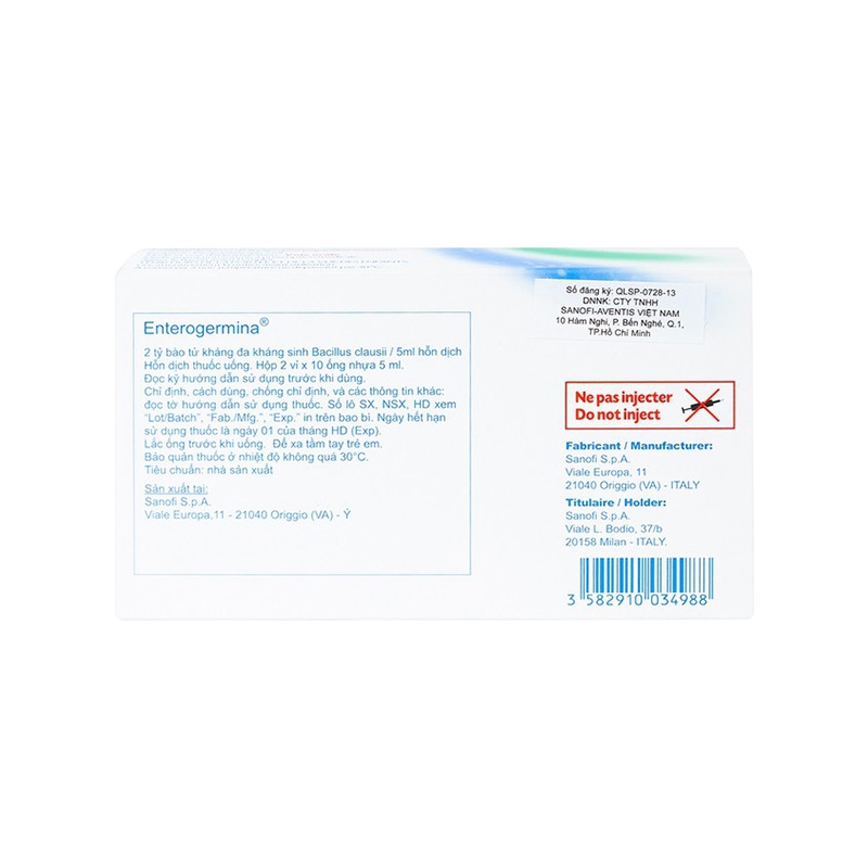 Mô tả ngắn: Enterogermina là sản phẩm của nhà sản xuất Sanofi (Italia), có thành phần chính bào tử kháng đa kháng sinh Bacillus clausii. Thuốc được dùng để điều trị và phòng ngừa rối loạn hệ vi khuẩn đường ruột và bệnh lý kém hấp thu vitamin nội sinh, điều trị hỗ trợ để phục hồi hệ vi khuẩn đường ruột bị ảnh hưởng khi dùng thuốc kháng sinh hoặc hóa trị liệu, rối loạn tiêu hóa cấp và mạn tính ở trẻ em do nhiễm độc hoặc rối loạn hệ vi khuẩn đường ruột và kém hấp thu vitamin.
