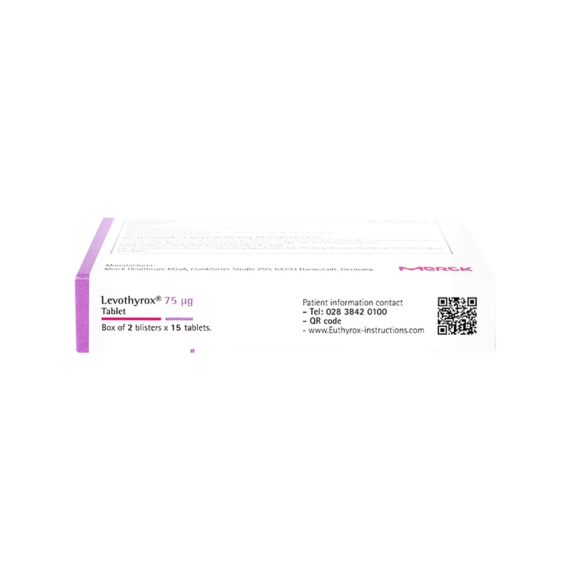 Có Mô tả ngắn: Thuốc Levothyrox 75µg là sản phẩm của Merck Healthcare KGaA (Đức) chứa hoạt chất Levothyroxine natri giúp điều trị bướu giáp đơn thuần lành tính, điều trị dự phòng tái phát sau khi phẫu thuật bướu giáp đơn thuần, tùy thuộc vào tình trạng hormon sau phẫu thuật, điều trị thay thế trong suy giáp, điều trị ức chế trong ung thư giáp. Phối hợp với thuốc kháng giáp trong điều trị cường giáp.