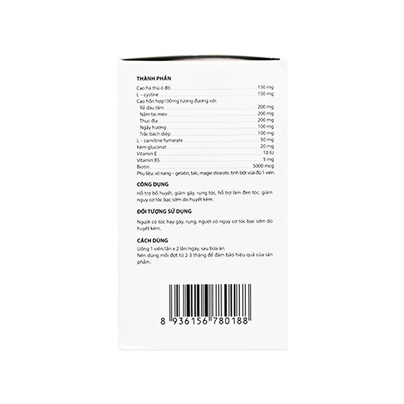 Thành phần: Cao hà thủ ô đỏ, L–cystine, rễ dâu tằm, nấm tai mèo, thục địa, ngưu tất, trắc bách diệp, L–carnitine fumarate, kẽm gluconat, vitamin E, vitamin B5, biotin.