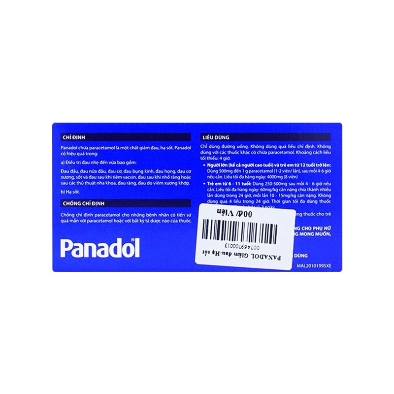 Mô tả ngắn Thuốc Panadol xanh 500mg được sản xuất bởi Công ty Cổ phần Dược phẩm Sanofi-Synthelabo Việt Nam, với thành phần chính Paracetamol. Panadol 500mg dùng để hạ sốt và điều trị đau nhẹ đến trung bình (đau đầu, đau nửa đầu, đau cơ, đau bụng kinh, đau họng, đau cơ xương, sốt và đau sau khi tiêm vaccine, đau sau khi nhổ răng hoặc sau các thủ thuật nha khoa, đau răng, đau do viêm xương khớp).
