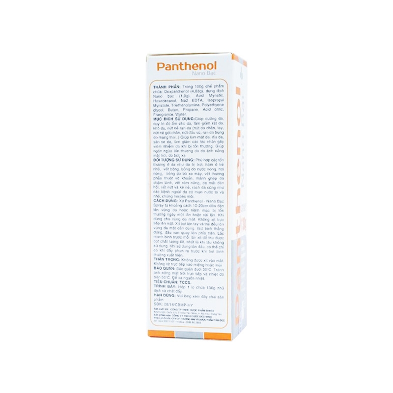 Mô tả ngắn: Panthenol Nano Bạc Spray giúp dưỡng da, duy trì độ ẩm cho da, làm giảm rát da, khô da, nứt nẻ rạn da (nứt da chân, tay, nứt nẻ gót chân, nứt đầu vú, rạn da vùng bụng do mang thai,...), giúp làm mát da, dịu da, săn se da, làm giảm các tác nhân gây viêm nhiễm da, tổn thương.