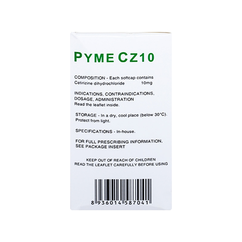 Mô tả ngắn: Pyme CZ10 được sản xuất bởi Công ty Cổ phần Pymepharco, với thành phần chính Cetirizine dihydrochloride, là thuốc dùng để điều trị triệu chứng các biểu hiện dị ứng như viêm mũi dị ứng, sổ mũi theo mùa và không theo mùa, các bệnh ngoài da gây ngứa do dị ứng, mày đay mạn tính và viêm kết mạc dị ứng.
