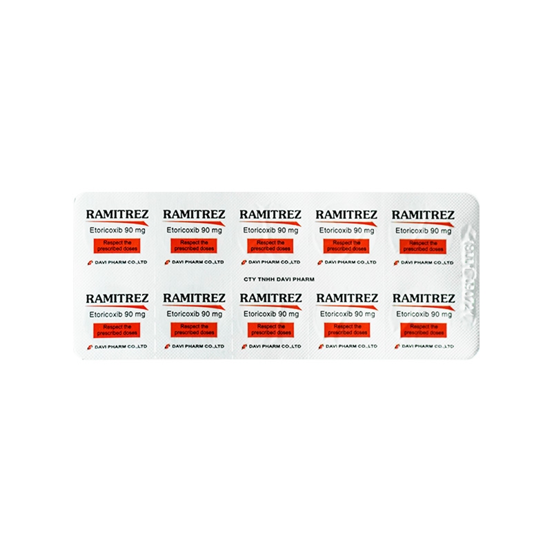 Mô tả ngắn: Thuốc Ramitrez 90mg là sản phẩm của Công ty cổ phần dược phẩm Đạt Vi Phú (Davipharm) chứa hoạt chất Etoricoxib dùng trong điều trị cấp tính và mãn tính các dấu hiệu, triệu chứng bệnh viêm xương khớp (osteoarthritis-OA) và viêm khớp dạng thấp (rheumatoid arthritis-RA), viêm đốt sống dính khớp (ankylosing spondylitis-AS), viêm khớp thống phong cấp tính (acute gouty arthritis), các cơn đau cấp tính, bao gồm chứng đau bụng kinh nguyên phát.