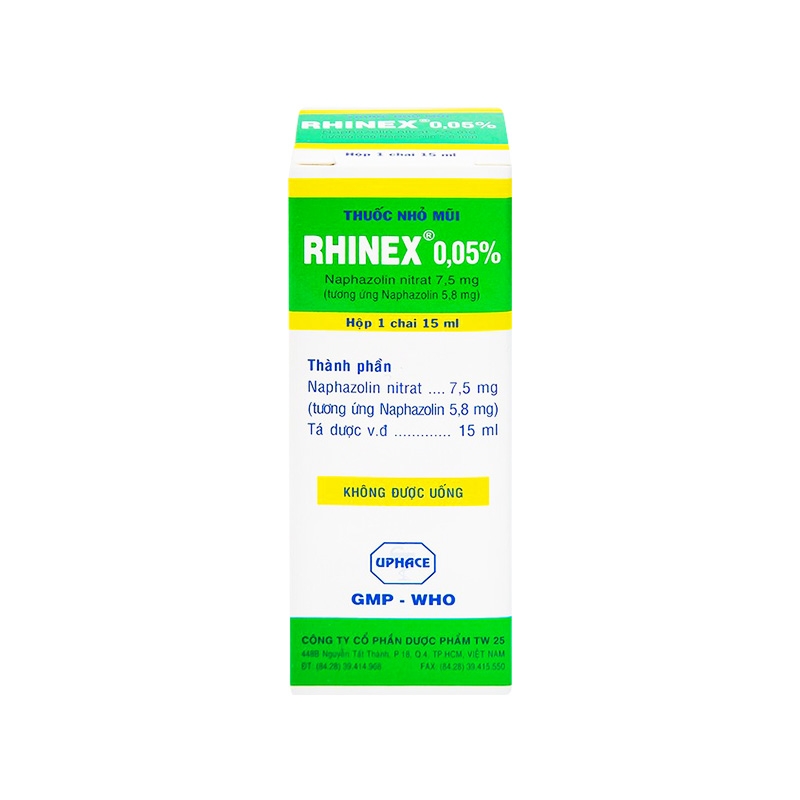 Mô tả ngắn: Thuốc Rhinex 0,5% của công ty cổ phần dược phẩm TW 25, chứa dược chất chính là naphazolin dưới dạng naphazolin nitrat, là 1 chất cường giao cảm có tác dụng làm co mạch tại chỗ nhanh và kéo dài, giảm sưng và sung huyết khi nhỏ hoặc xịt thuốc vào niêm mạc mũi. Đối tượng sử dụng Trẻ em, Người lớn