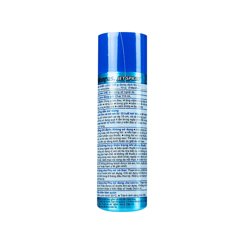 Chai xịt giảm đau Salonpas Jet Spray Hisamitsu 118Ml dùng xịt ngoài da tại vùng bị đau. Để tránh bị tê cóng, giữ chai cách da xa 10cm, và xịt không quá 1 giây.