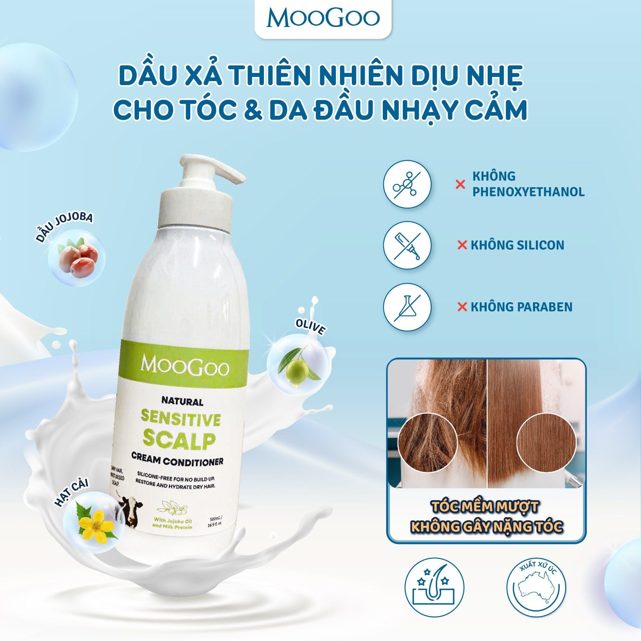 Dầu xả MooGoo Natural Scalp-Friendly Cream Conditioner là lựa chọn lý tưởng cho những ai có tóc và da đầu nhạy cảm, cần một sản phẩm tự nhiên – dịu nhẹ – an toàn khi dùng lâu dài. Với chiết xuất dầu Jojoba và dầu ô liu, dầu xả giúp cấp ẩm sâu, nuôi dưỡng sợi tóc mềm mượt mà không gây bết dính hay nặng tóc. Công thức không chứa silicon giúp tóc luôn nhẹ, không tích tụ, phù hợp cho cả da đầu dễ kích ứng. Sản phẩm được bổ sung protein sữa, hỗ trợ phục hồi và bảo vệ lớp sừng tự nhiên của tóc, giúp tóc khỏe hơn từ gốc đến ngọn. Đồng thời, Piroctone Olamine giúp cân bằng hệ vi sinh da đầu, hỗ trợ giảm ngứa và gàu, mang lại cảm giác dễ chịu sau mỗi lần sử dụng. Hương thơm nhẹ nhàng từ tinh dầu tự nhiên không chứa phthalate, an toàn cho da nhạy cảm, mang đến trải nghiệm thư giãn, thuần khiết mỗi ngày.