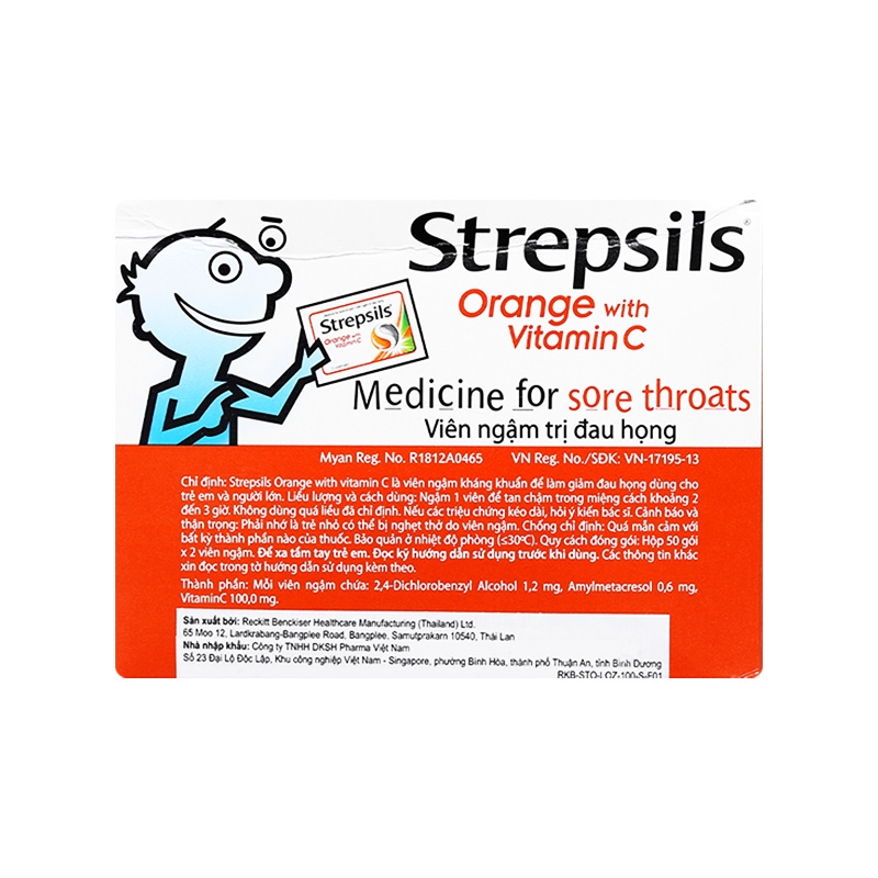 Mô tả ngắn: Strepsils Orange Vitamin C (Strepsils cam) 24 viên của Reckitt Benckiser Healthcare Manufacturing (Thailand) Ltd. Đây là viên ngậm chứa 2,4 – Dichlorobenzyl alcohol (Dybenal) 1,2 mg; Amylmetacresol 0,6 mg và Vitamin C 100 mg (chứa acid ascorbic 33,52 mg, natri ascorbate 75 mg). Viên ngậm có tính kháng khuẩn, được sử dụng trong điều trị viêm họng, làm giảm đau họng dùng cho trẻ em và người lớn.