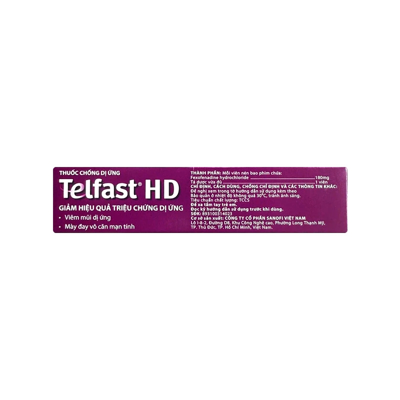 Mô tả ngắn: Thuốc Telfast HD 180mg được sản xuất bởi công ty Cổ Phần Sanofi Việt Nam, được chỉ định để điều trị viêm mũi dị ứng theo mùa và các biểu hiện ngoài da không biến chứng của mày đay vô căn mạn tính ở người lớn và trẻ em từ 12 tuổi trở lên.