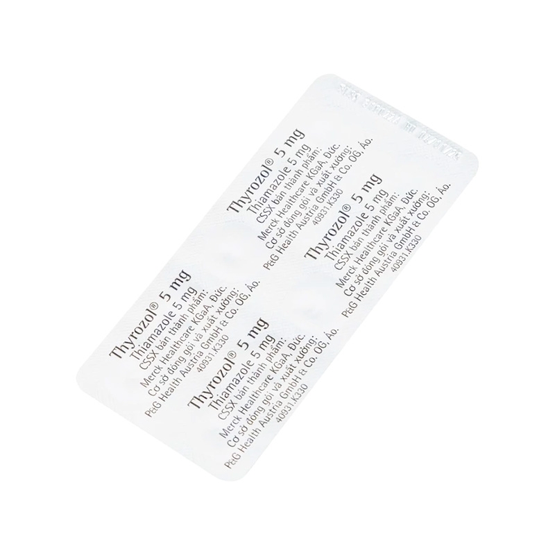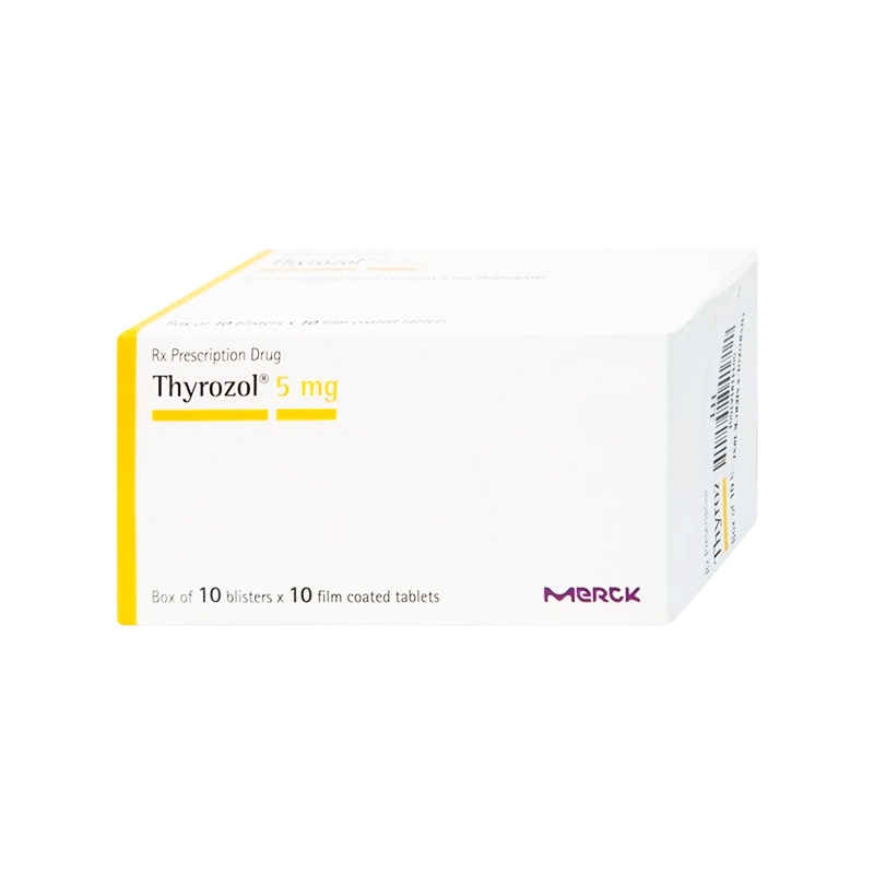 Mô tả ngắn: Thuốc “Thyrozol 5mg” được sản xuất bởi công ty Merck Healthcare KGaA, Đức. Mỗi viên nén bao phim chứa 5mg thiamazole. Viên nén bao phim Thyrozol 5mg màu vàng nhạt, tròn, 2 mặt lồi đường kính 9mm với một vạch chia trên cả hai mặt. Viên nén có thể được chia thành những liều bằng nhau.