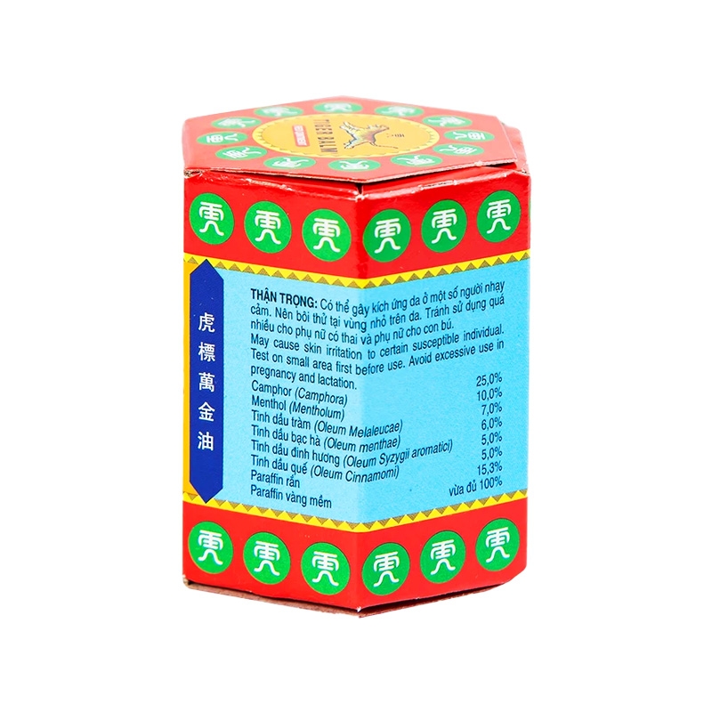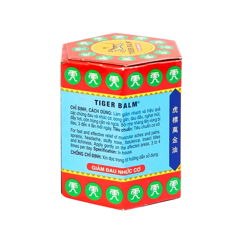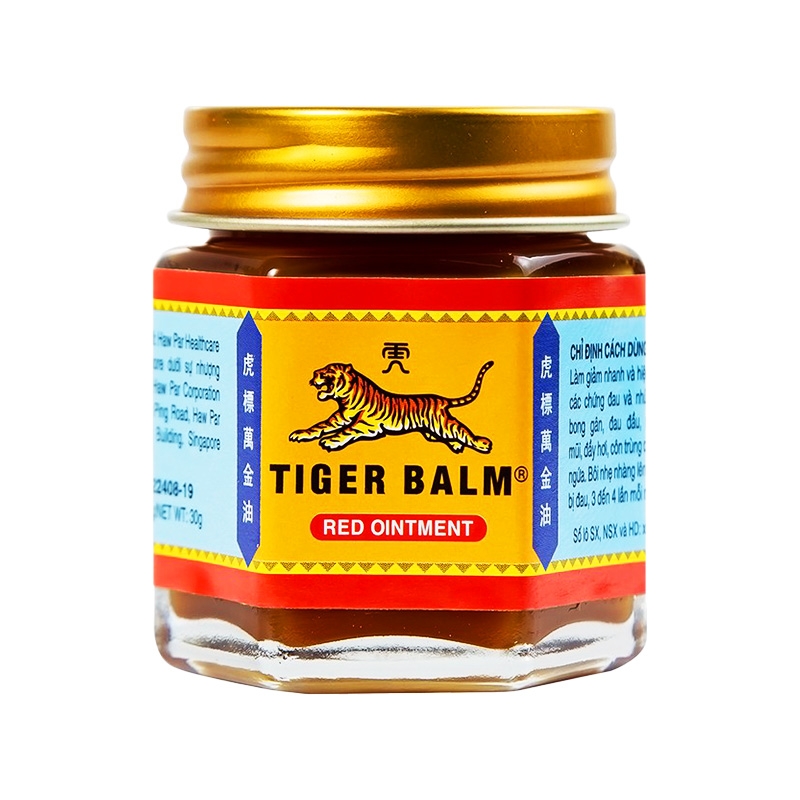 Mô tả ngắn: Tiger Balm® do công ty HAW PAR HEALTHCARE LIMITED, Singapore sản xuất, Tiger Balm® giảm các chứng đau đầu, ngạt mũi, đau do côn trùng cắn, ngứa, đau nhức cơ, bong gân và đầy hơi. Thuốc có dạng bào chế là thuốc mỡ dùng bôi ngoài da, thuốc mỡ màu nâu đỏ, có mùi đặc trưng của camphor và menthol. Hộp 1 lọ 19,4g thuốc mỡ bôi ngoài da.