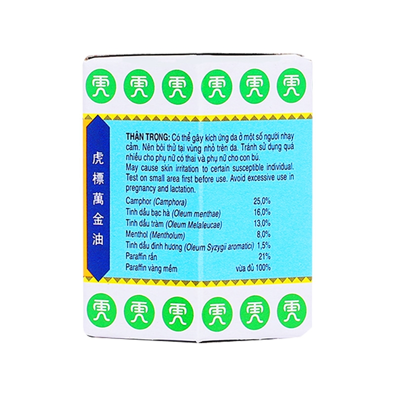 Thành phần: Menthol, Camphor, Tinh dầu bạc hà, Tinh dầu đinh hương, Tinh dầu tràm Chỉ định Ngứa, Nhức đầu, Bong gân, Đầy hơi, Nghẹt mũi, Côn trùng cắn Chống chỉ định Động kinh, Co giật