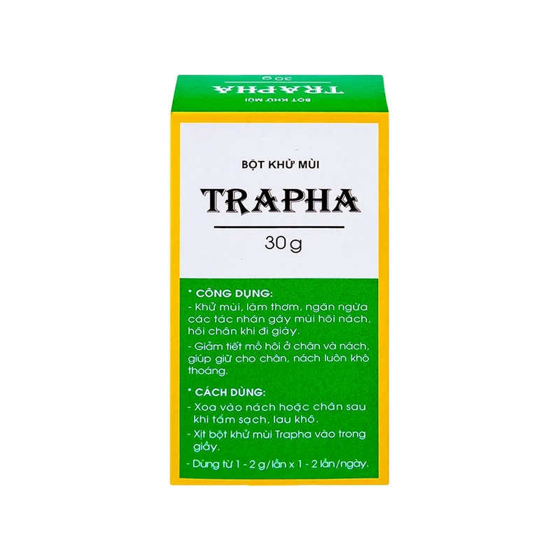 Mô tả ngắn: Bột khử mùi Trapha khử mùi, làm thơm, ngăn ngừa các tác nhân gây mùi hôi nách, hôi chân khi đi giày. Giảm tiết mồ hôi ở chân và nách, giúp giữ cho chân, nách luôn khô thoáng.