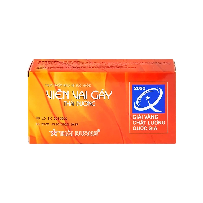 Viên Vai Gáy Thái Dương là thực phẩm bảo vệ sức khỏe có công dụng hỗ trợ giảm các triệu chứng đau nhức mỏi vai gáy, giúp lưu thông khí huyết và hỗ trợ giảm nguy cơ huyết khối, tắc mạch. Sản phẩm được Bộ Y tế kiểm định chất lượng và cho phép lưu hành trên cả nước.
